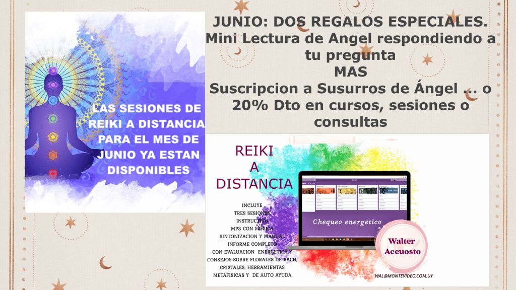 Las sesiones de Reiki a Distancia de JUNIO te podrán ayudar, porque además de la sesión en sí (son tres), el informe final y la SINTONIZACION CON SU CORRESPONDIENTE MANUAL, incluye DOS REGALOS ESPECIALES.