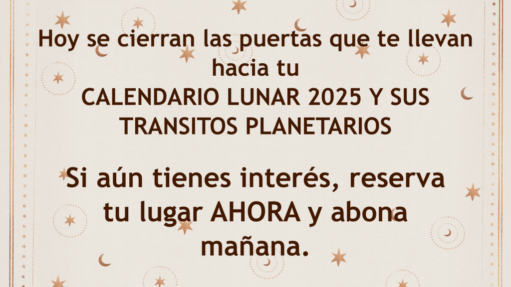 Te recuerdo que el CALENDARIO LUNAR 2025 Y SUS TRANSITOS PLANETARIOS es un estudio de aproximadamente entre 130 a 150 páginas, esta PERSONALIZADO de acuerdo a tus datos de nacimiento e incluye varios e importantes regalos especiales: