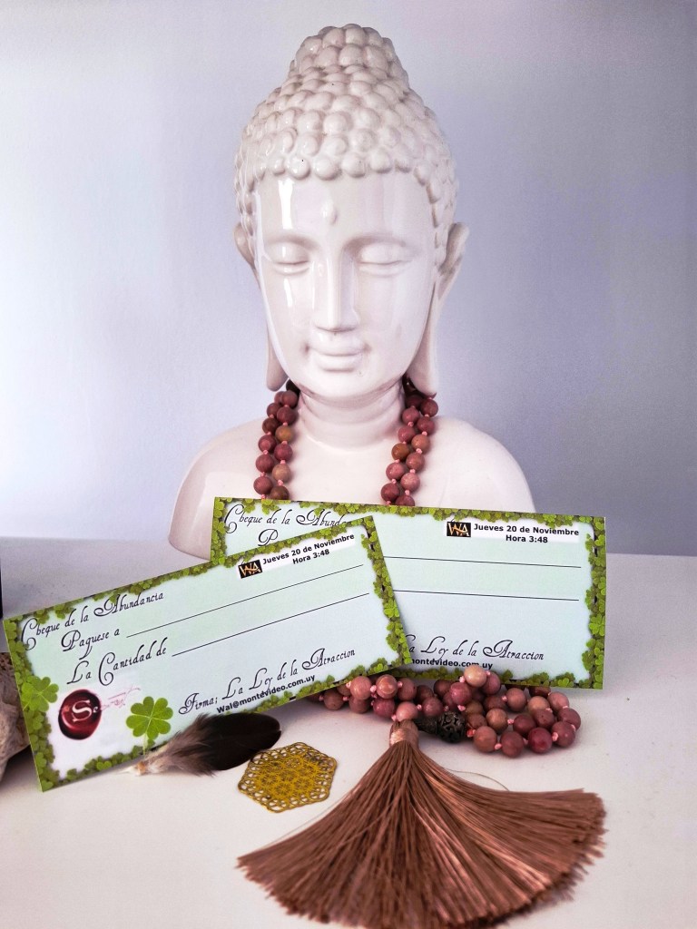 CHEQUERA DE LA ABUNDANCIA con las leyes de la Ley de atracción más doce cheques fechados y con sus horas de activacion, más el SIMBOLO MAGNETICO del año.